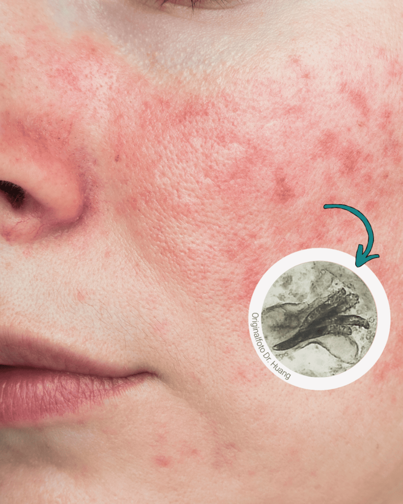 Die Demodex-Milbe tritt bei fast jedem erwachsenen Menschen auf und ist in der Regel harmlos, kann aber bei verstärktem Befall Krankheiten auslösen. Auf der Haut vieler Rosacea-Patient:innen wurde eine erhöhte Dichte an Demodex-Milben festgestellt. Die Haut reagiert auf zu viele Demodex-Milben mit einer Immunreaktion. Es werden antimikrobielle Stoffe, entzündliche Botenstoffe und Antikörper gegen die Milben gebildet. Diese Entzündungsreaktion kann typische Rosacea-Symptome wie Rötungen, Papeln und Pusteln hervorrufen oder verstärken. Daher gilt die Demodex-Milbe als zusätzlicher Auslöser von Rosacea.